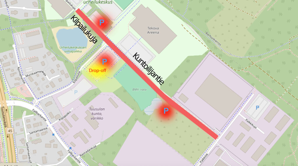 - Paraati kulkee Kilpailukujaa ja Kuntoijantietä pitkin kohti Palkkitietä. Paraatin aikana alueella on drop-of ja pick-up piste BMX-radan parkkipaikalla, ennen Kilpailutien ja Kuntoilijantie risteystä.